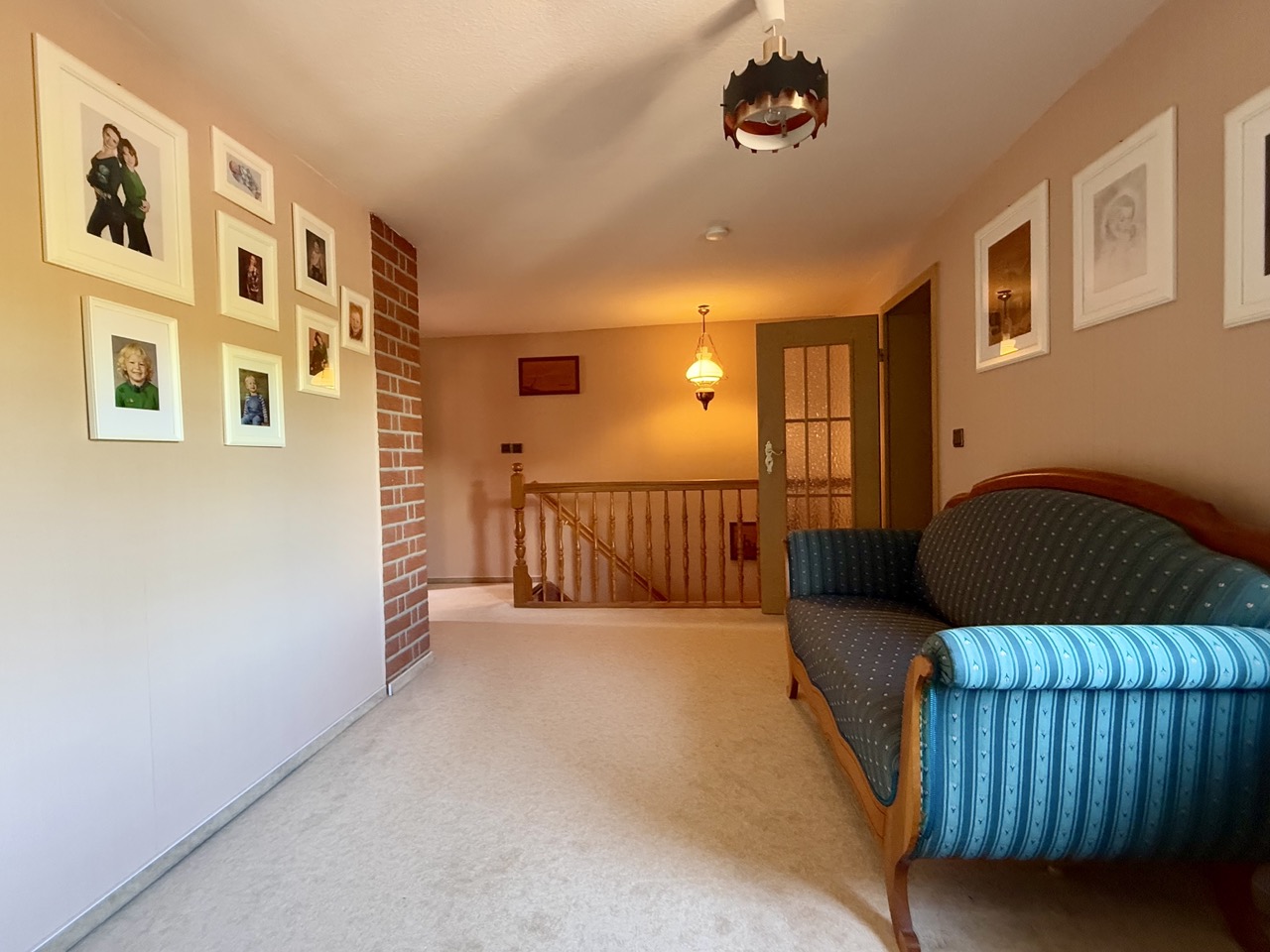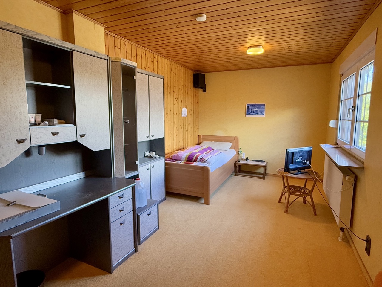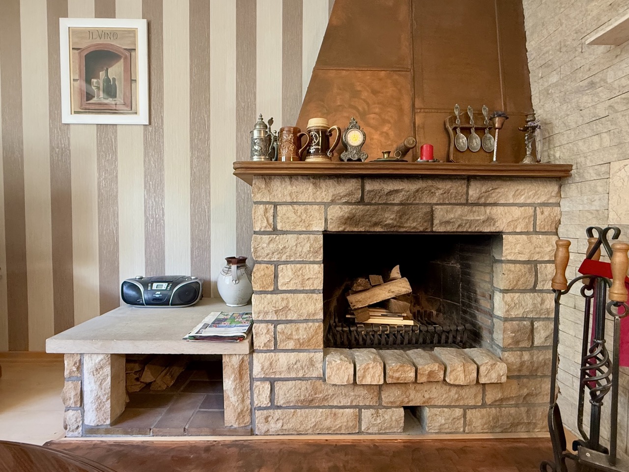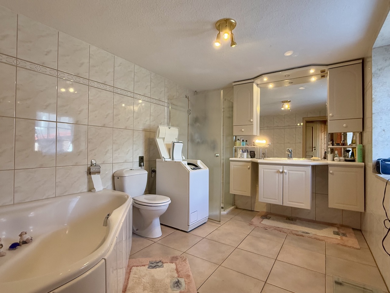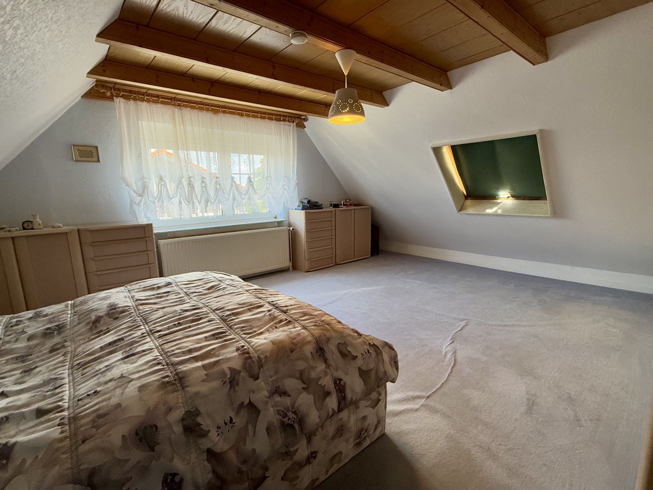 Der Wohnbereich ist mit Parkett, Teppich und Fliesen gestaltet, ein Kamin sorgt für eine angenehme Atmosphäre. Die zentrale Gasheizung wurde zuletzt im Jahr 2000 modernisiert. Im Außenbereich stehen drei Stellplätze in einer Garage zur Verfügung. Der Keller bietet zusätzlichen Stauraum.